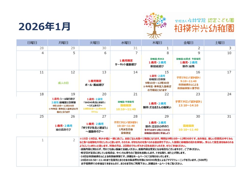 令和8年度の満3歳児以降の入園に向けて、願書配布・受付面接や相模栄光幼稚園の教育方針、保育内容、入園までの流れについてご説明します。また、同時に満1歳以上からご利用いただける未就園児教室の内容についてもご説明します。